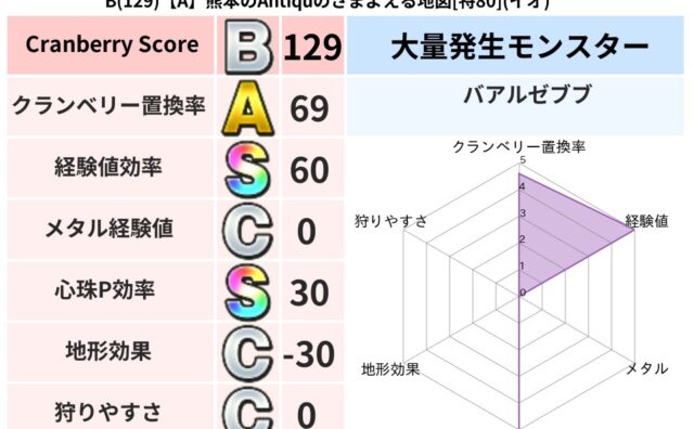 クランベリーボット判定結果の詳細クランベリースコア176クランベリー置換率67%大量発生モンスターバアルゼブブ超耐性ジバリア(0%)超耐性・弱耐性なしデイン系統狩りけもの系55%こころ道 完全一致モンスターキャットフライニンジャ(共通Lv1...