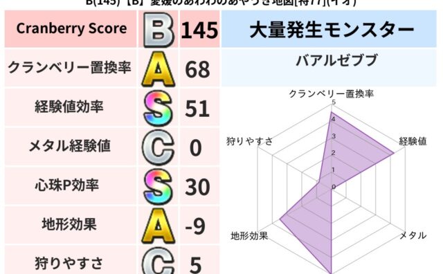 クランベリーボット判定結果の詳細クランベリースコア158クランベリー置換率64%大量発生モンスターバアルゼブブ超耐性ギラ(9%)超耐性・弱耐性なしイオデインこころ道 完全一致モンスタードロヌーバニンジャ(波道Lv5)ひとくいばこ魔剣士(刃道...