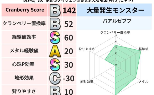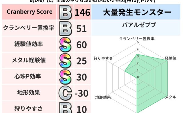 クランベリーボット判定結果の詳細クランベリースコア:148クランベリー置換率:66%大量発生モンスター:バアルゼブブジバリア超耐性(46%)こころ道 完全一致モンスタードロヌーバニンジャ(波道Lv5)キースドラゴン大魔導士(理力道Lv5)だ...