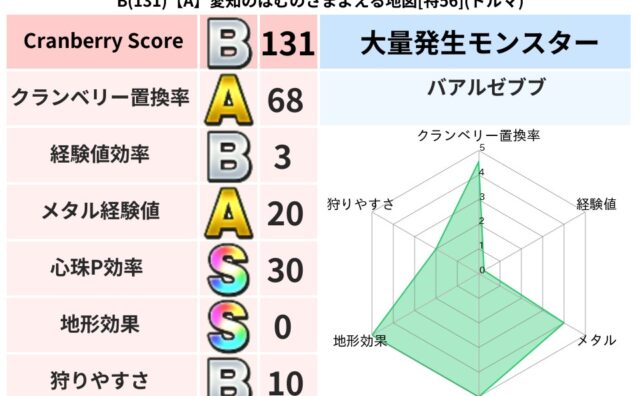 クランベリーボット判定結果の詳細クランベリースコア:131クランベリー置換率:68%大量発生モンスター:バアルゼブブドルマ超耐性(0%)こころ道 完全一致モンスターねこまどうニンジャ(風道Lv5)かっちゅうアリ魔人(共通Lv1)アイアンクッ...