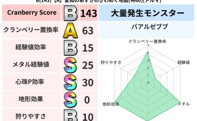 クランベリーボット判定結果の詳細クランベリースコア168クランベリー置換率69%大量発生モンスターバアルゼブブ超耐性イオ(2%)超耐性・弱耐性なしバギデインこころ道 完全一致モンスターベロニャーゴ大魔道士(理力道Lv5)てつのさそりゴッドハ...