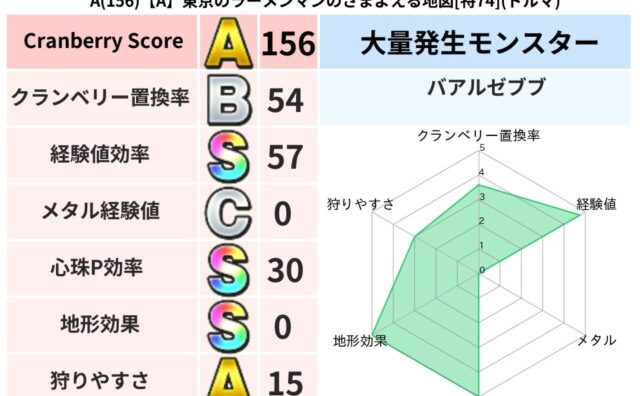クランベリーボット判定結果の詳細クランベリースコア156クランベリー置換率54%大量発生モンスターバアルゼブブ超耐性ドルマ(0%)超耐性・弱耐性なしバギこころ道 完全一致モンスターキャットフライニンジャ(共通Lv1)ばくだん岩大神官(舞道L...