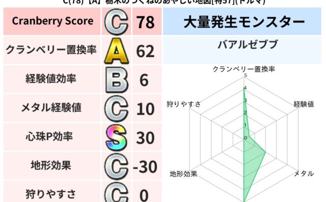 クランベリーボット判定結果の詳細クランベリースコア:78クランベリー置換率:62%大量発生モンスター:バアルゼブブドルマ超耐性(81%)こころ道 完全一致モンスターどくろあらいゴッドハンド(守護道Lv5)キースドラゴン大魔導士(理力道Lv5...