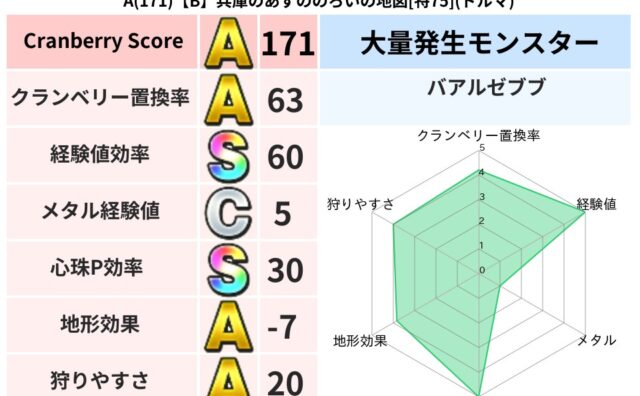 クランベリーボット判定結果の詳細クランベリースコア171クランベリー置換率63%大量発生モンスターバアルゼブブ超耐性ドルマ(6%)超耐性・弱耐性なしバギデイン系統狩りけもの系52%こころ道 完全一致モンスターどくろあらいゴッドハンド(守護道...