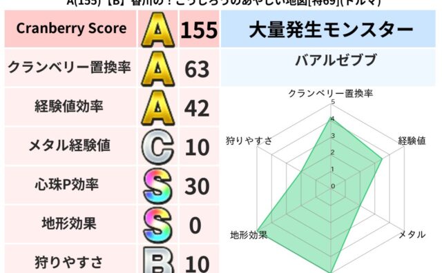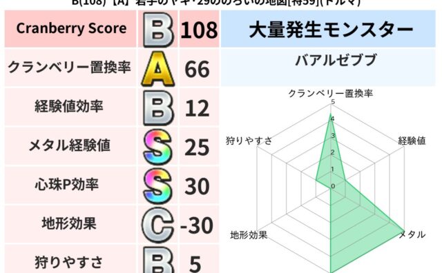クランベリーボット判定結果の詳細クランベリースコア:108クランベリー置換率:66%大量発生モンスター:バアルゼブブドルマ超耐性(74%)超耐性・弱耐性なし:ジバリアこころ道 完全一致モンスターキースドラゴン大魔導士(理力道Lv5)ミニデー...
