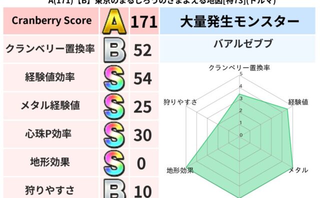 クランベリーボット判定結果の詳細クランベリースコア176クランベリー置換率47%大量発生モンスターバアルゼブブ超耐性バギ(0%)超耐性・弱耐性なしデイン系統狩りけもの系77%こころ道 完全一致モンスターねこまどうニンジャ(風道Lv5)スカル...