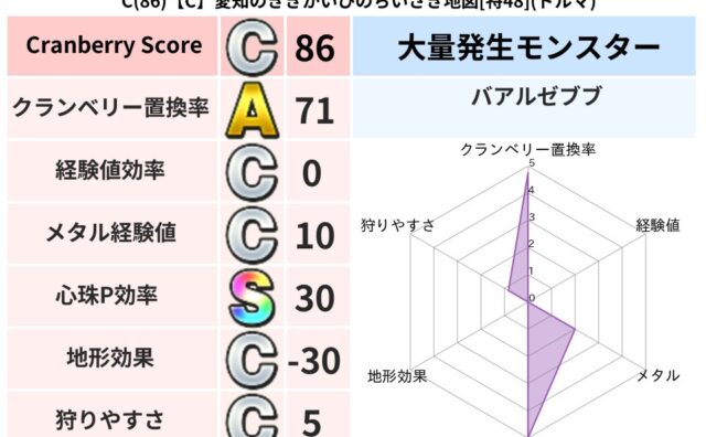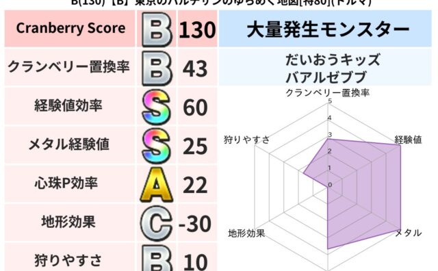 クランベリーボット判定結果の詳細クランベリースコア142クランベリー置換率63%大量発生モンスターバアルゼブブ,ガニメデス超耐性ドルマ(84%)超耐性・弱耐性なしバギこころ道 完全一致モンスターくさった死体ゴッドハンド(守護道Lv5)大魔道...