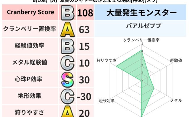クランベリーボット判定結果の詳細クランベリースコア126クランベリー置換率64%大量発生モンスターバアルゼブブ,ヒョウモンダーク超耐性ヒャド(64%)こころ道 完全一致モンスターくさった死体ゴッドハンド(守護道Lv5)大魔道士(魔力道Lv5...