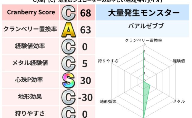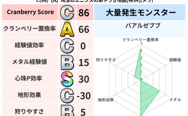 地図判定結果 C(87)【A】京都のサトルのざわめく地図[特54](ギラ) クランベリーボット判定結果の詳細クランベリースコア:87クランベリー置換率:66%大量発生モンスター:バアルゼブブギラ超耐性(0%)こころ道 完全一致モンスターがいこつ: 魔剣士(共通Lv1)ストーンマン: ゴッドハンド(守護道Lv5)リカ... 2024/01/30 02:52 地図判定結果