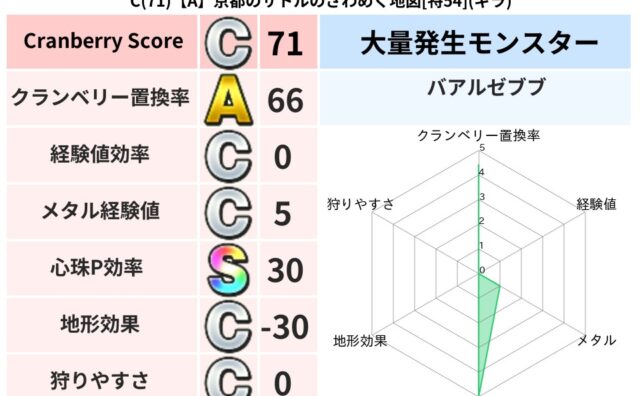 地図判定結果 C(71)【A】京都のサトルのざわめく地図[特54](ギラ) クランベリーボット判定結果の詳細クランベリースコア:71クランベリー置換率:66%大量発生モンスター:バアルゼブブギラ超耐性(37%)こころ道 完全一致モンスターがいこつ魔剣士(共通Lv1)ストーンマンゴッドハンド(守護道Lv5)リカントマ... 2024/01/30 02:52 地図判定結果