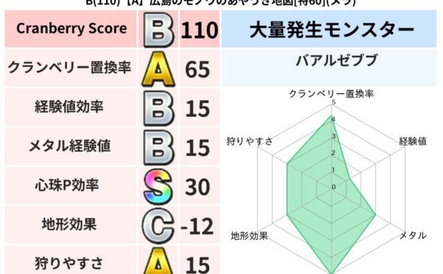 スコアA A(157)【A】広島のモノウのあやうき地図[特60](メラ) クランベリーボット判定結果の詳細クランベリースコア:157クランベリー置換率:65%大量発生モンスター:バアルゼブブメラ超耐性(0%)系統狩り(43%)こころ道 完全一致モンスターみならいあくま: ニンジャ(風道Lv5)フレイム: 守り人(... 2024/01/25 20:23 スコアA地図判定結果