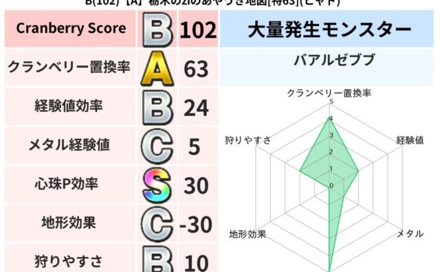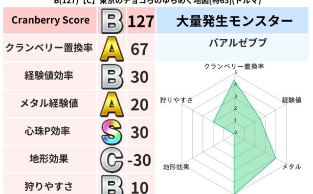 クランベリーボット判定結果の詳細クランベリースコア87クランベリー置換率63%大量発生モンスターバアルゼブブ超耐性ヒャド(85%)こころ道 完全一致モンスターブラウニー守り人(共通Lv1)キースドラゴン大魔道士(理力道Lv5)アイアンクック...