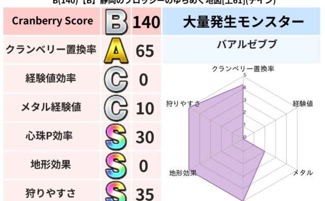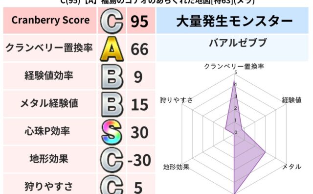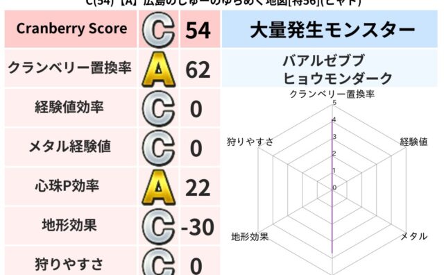 クランベリーボット判定結果の詳細クランベリースコア108クランベリー置換率63%大量発生モンスターバアルゼブブ超耐性メラ(46%)こころ道 完全一致モンスターアイアンクック守り人(まもり道Lv5)ホタテワラビーニンジャ(風道Lv10)マミー...