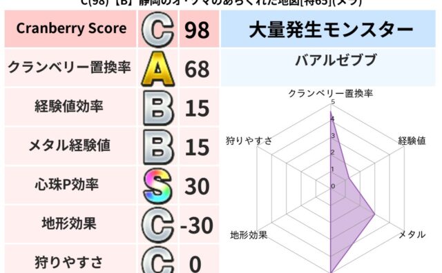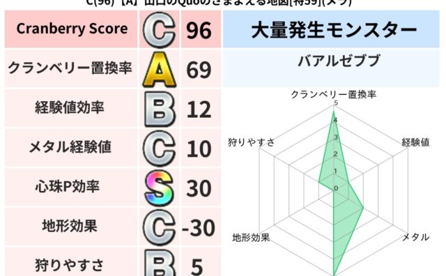 クランベリーボット判定結果の詳細クランベリースコア:111クランベリー置換率:69%大量発生モンスター:バアルゼブブメラ超耐性(0%)こころ道 完全一致モンスターがいこつ: 魔剣士(共通Lv1)フレイム: 守り人(ささえ道Lv5)ヒートギズ...
