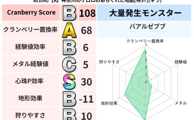 クランベリーボット判定結果の詳細クランベリースコア:108クランベリー置換率:68%大量発生モンスター:バアルゼブブギラ超耐性(9%)こころ道 完全一致モンスターキメラ大魔導士(共通Lv1)キャットフライニンジャ(共通Lv1)どれいへいしド...
