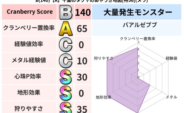 クランベリーボット判定結果の詳細クランベリースコア:91クランベリー置換率:63%大量発生モンスター:バアルゼブブメラ超耐性(46%)こころ道 完全一致モンスターどくどくゾンビ魔剣士(共通Lv1)シャドーニンジャ(波道Lv30)かっちゅうア...
