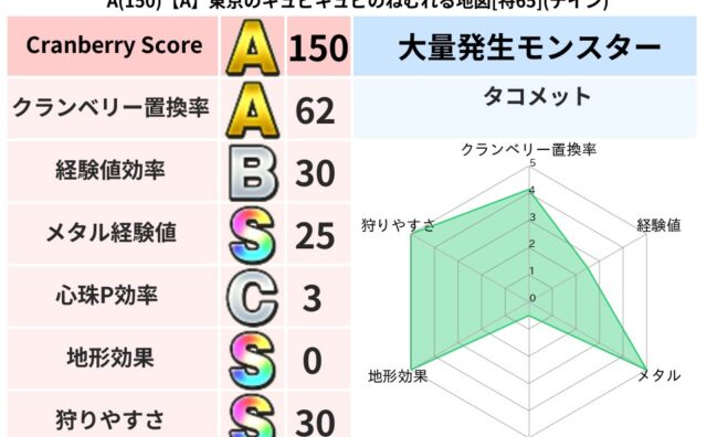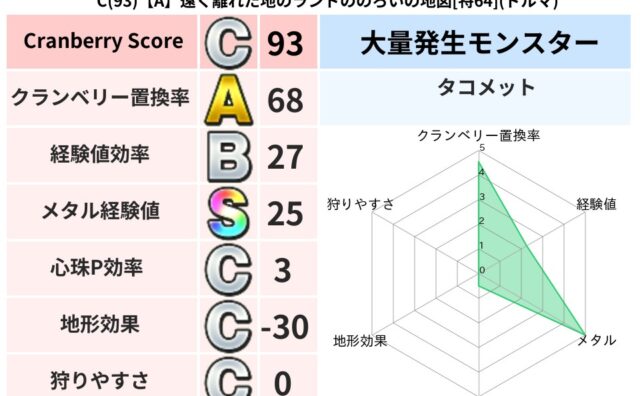 クランベリーボット判定結果の詳細クランベリースコア:92クランベリー置換率:61%大量発生モンスター:さそりばち,タコメットイオ超耐性(31%)こころ道 完全一致モンスターどくイモムシニンジャ(波道Lv5)ブラウニー守り人(共通Lv1)さそ...