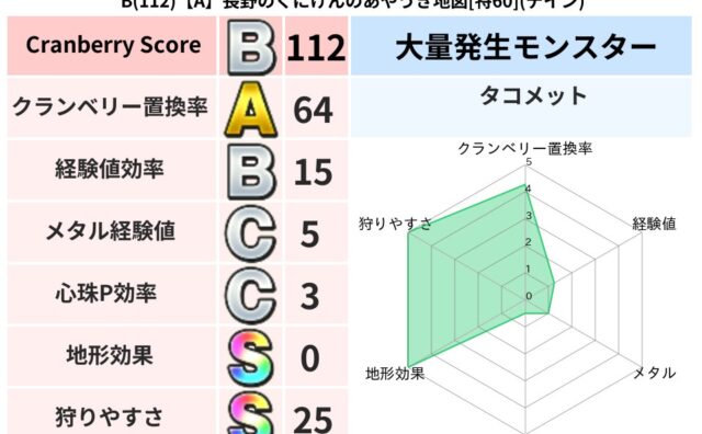 クランベリーボット判定結果の詳細クランベリースコア:112クランベリー置換率:64%大量発生モンスター:タコメットデイン超耐性(0%)こころ道 完全一致モンスターさまようよろいゴッドハンド(守護道Lv5)キースドラゴン大魔導士(理力道Lv5...