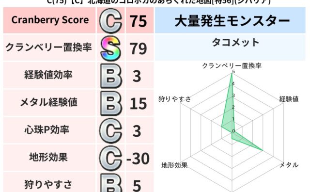 クランベリーボット判定結果の詳細クランベリースコア:95クランベリー置換率:79%大量発生モンスター:タコメットジバリア超耐性(0%)こころ道 完全一致モンスタースカルガルー: ドラゴン(竜道Lv5)デビルアーマー: 大神官(舞道Lv5)か...