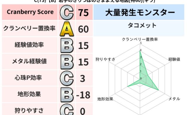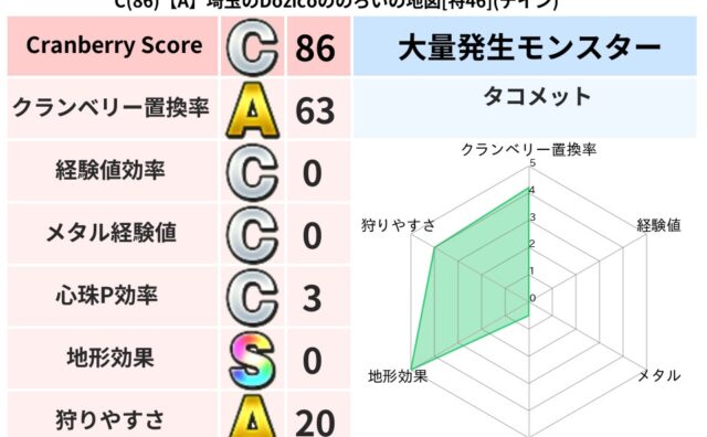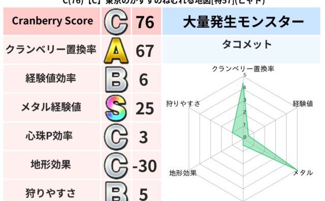 クランベリーボット判定結果の詳細クランベリースコア76クランベリー置換率63%大量発生モンスタータコメット超耐性デイン(0%)系統狩り水系40%こころ道 完全一致モンスターくさった死体ゴッドハンド(守護道Lv5)大魔道士(魔力道Lv5)おお...