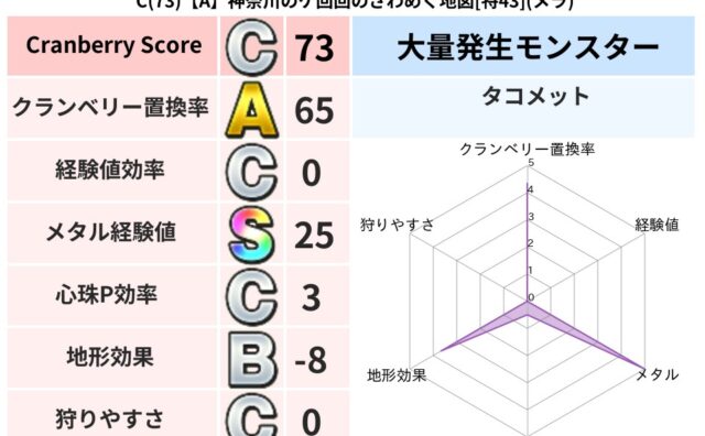 クランベリーボット判定結果の詳細クランベリースコア51クランベリー置換率73%大量発生モンスタータコメット超耐性ヒャド(93%)系統狩り水系44%こころ道 完全一致モンスターデビルアーマー大神官(舞道Lv5)びっくりサタン大神官(共通Lv1...