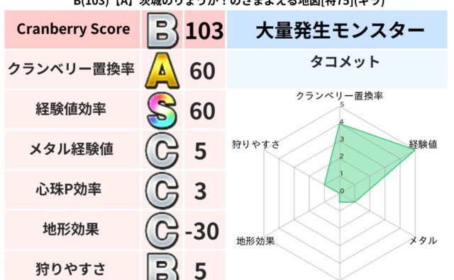 クランベリーボット判定結果の詳細クランベリースコア135クランベリー置換率63%大量発生モンスタータコメット超耐性メラ(1%)こころ道 完全一致モンスターしりょうのきし大神官(舞道Lv5)だいまどうゴッドハンド(武道Lv40)じんめんじゅ大...