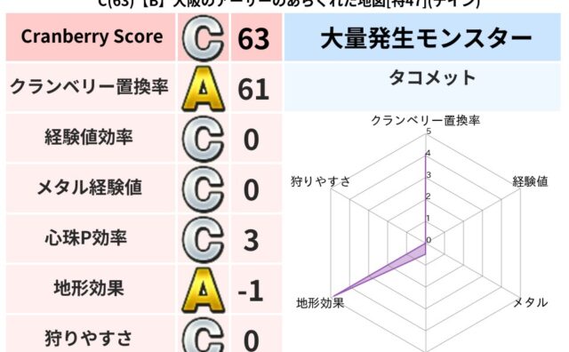 クランベリーボット判定結果の詳細クランベリースコア79クランベリー置換率60%大量発生モンスターメーダロード,タコメット超耐性ヒャド(34%)超耐性・弱耐性なしジバリアこころ道 完全一致モンスターメーダロードゴッドハンド(武道Lv10)大魔...