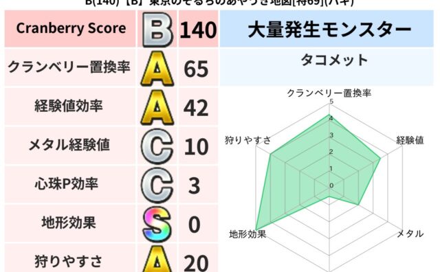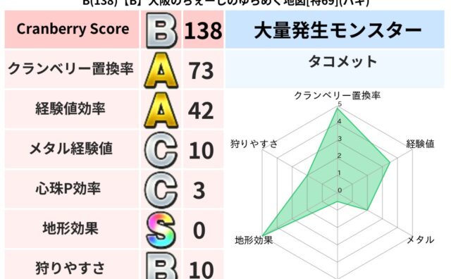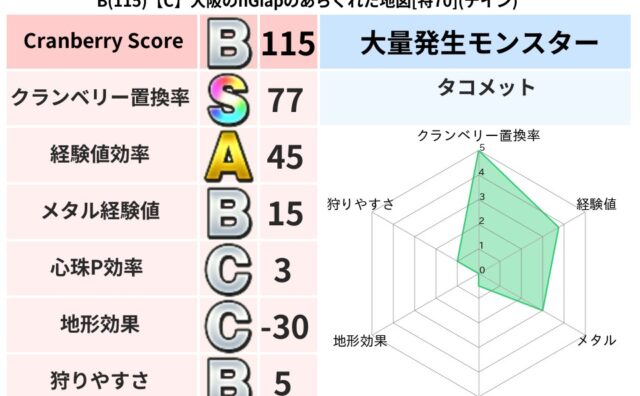 クランベリーボット判定結果の詳細クランベリースコア62クランベリー置換率64%大量発生モンスタータコメット超耐性ジバリア(46%)超耐性・弱耐性なしドルマこころ道 完全一致モンスターおおさそりゴッドハンド(武道Lv5)ドラゴン(共通Lv1)...