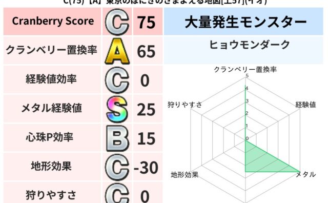 地図判定結果 C(75)【A】東京のぽにきのさまよえる地図[上57](イオ) クランベリーボット判定結果の詳細クランベリースコア:75クランベリー置換率:65%大量発生モンスター:ヒョウモンダークイオ超耐性(44%)こころ道 完全一致モンスターフレイム守り人(ささえ道Lv5)かっちゅうアリ魔人(共通Lv1)パペットマ... 2025/09/28 22:32 地図判定結果