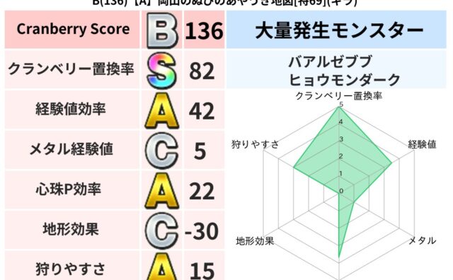 地図判定結果 B(136)【A】岡山のぬぴのあやうき地図[特69](ギラ) クランベリーボット判定結果の詳細クランベリースコア:136クランベリー置換率:82%大量発生モンスター:バアルゼブブ,ヒョウモンダークギラ超耐性(35%)超耐性・弱耐性なし:バギ系統狩り(41%)こころ道 完全一致モンスターデビルアーマー大... 2025/09/20 17:28 地図判定結果置換率S