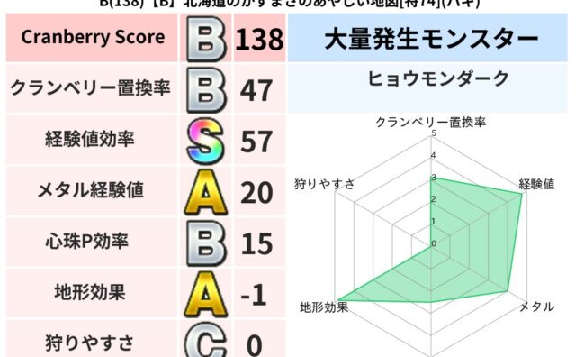 地図判定結果 B(138)【B】北海道のかずまさのあやしい地図[特74](バギ) クランベリーボット判定結果の詳細クランベリースコア138クランベリー置換率47%大量発生モンスターヒョウモンダーク超耐性バギ(0%)こころ道 完全一致モンスターキメラ大魔道士(共通Lv1)キャットフライニンジャ(共通Lv1)リカントマムルド... 2025/10/17 00:14 地図判定結果