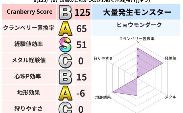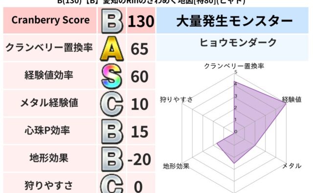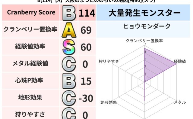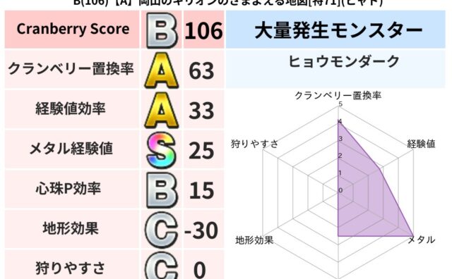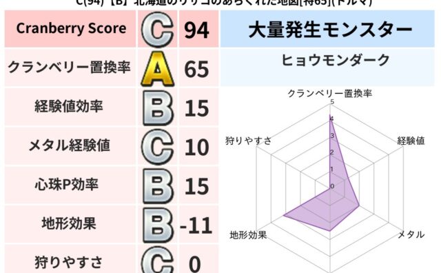 クランベリーボット判定結果の詳細クランベリースコア109クランベリー置換率64%大量発生モンスターだいおうキッズ,ヒョウモンダーク超耐性ギラ(39%)超耐性・弱耐性なしヒャドバギこころ道 完全一致モンスターストーンマンゴッドハンド(守護道L...