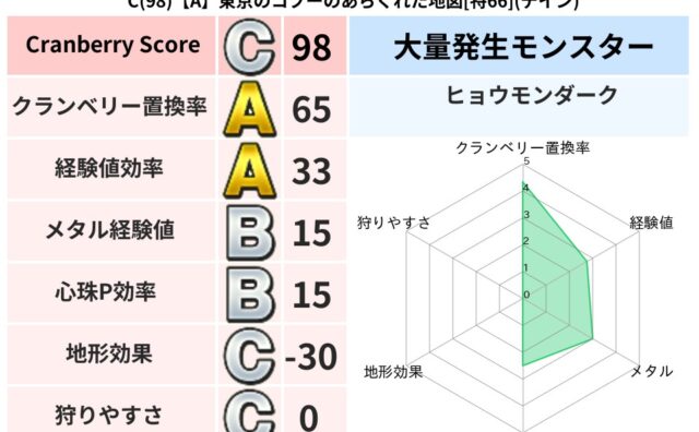 クランベリーボット判定結果の詳細クランベリースコア:135クランベリー置換率:80%大量発生モンスター:ヒョウモンダークメラ超耐性(81%)超耐性・弱耐性なし:イオ,ジバリアこころ道 完全一致モンスターデビルアーマー大神官(舞道Lv5)どろ...