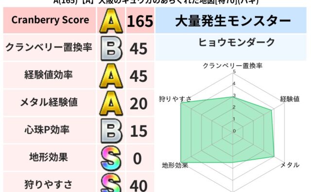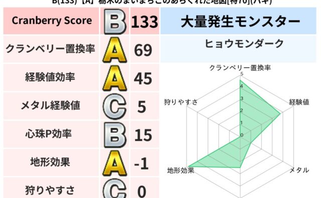 クランベリーボット判定結果の詳細クランベリースコア88クランベリー置換率66%大量発生モンスターヒョウモンダーク超耐性ギラ(74%)超耐性・弱耐性なしイオヒャドこころ道 完全一致モンスターフレイム守り人(ささえ道Lv5)どろにんぎょう守り人...