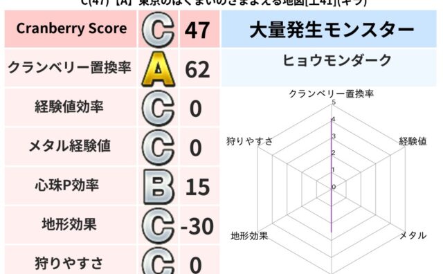 クランベリーボット判定結果の詳細クランベリースコア:163クランベリー置換率:77%大量発生モンスター:バアルゼブブ,ヒョウモンダークギラ超耐性(9%)超耐性・弱耐性なし:ジバリアこころ道 完全一致モンスターベロニャーゴ: 大魔導士(理力道...