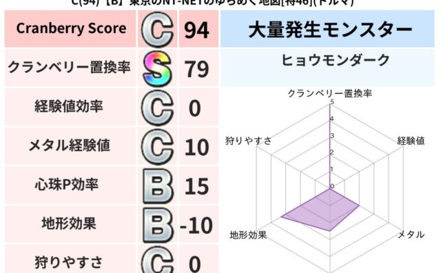 クランベリーボット判定結果の詳細クランベリースコア:123クランベリー置換率:47%大量発生モンスター:ヒョウモンダークイオ超耐性(16%)超耐性・弱耐性なし:ジバリアこの地図を探す・受け取るDiscordの判定結果を見る「大阪のかいのちい...