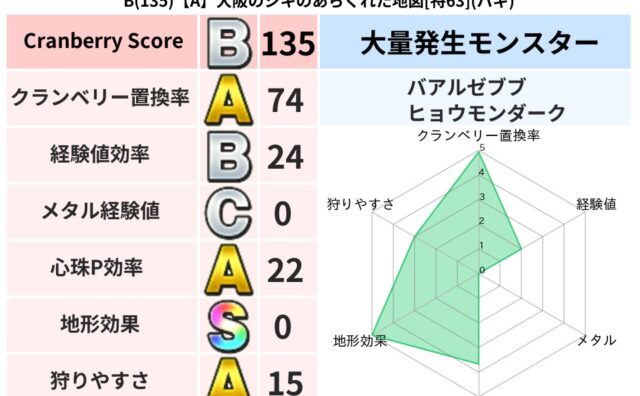 クランベリーボット判定結果の詳細クランベリースコア120クランベリー置換率68%大量発生モンスターヒョウモンダーク超耐性イオ(0%)こころ道 完全一致モンスターどくろあらいゴッドハンド(守護道Lv5)キースドラゴン大魔道士(理力道Lv5)ミ...