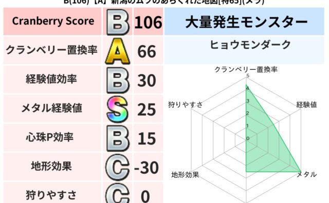 クランベリーボット判定結果の詳細クランベリースコア134クランベリー置換率75%大量発生モンスターヒョウモンダーク,わらいぶくろ超耐性ドルマ(0%)こころ道 完全一致モンスターリカントマムルドラゴン(竜道Lv5)フレイム守り人(ささえ道Lv...