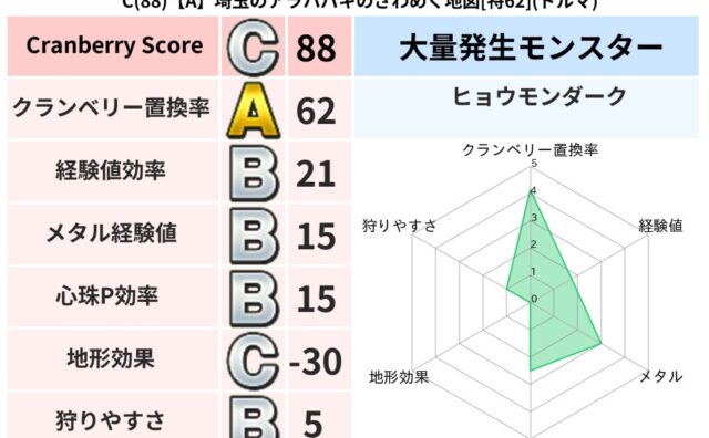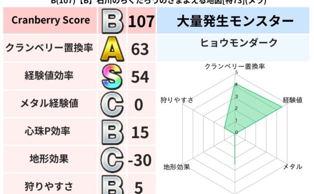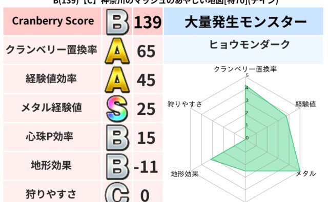 クランベリーボット判定結果の詳細クランベリースコア:145クランベリー置換率:47%大量発生モンスター:ヒョウモンダークギラ超耐性(10%)超耐性・弱耐性なし:デイン,ドルマこころ道 完全一致モンスターどくイモムシ: ニンジャ(波道Lv5)...