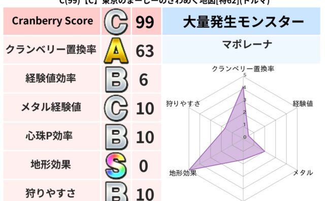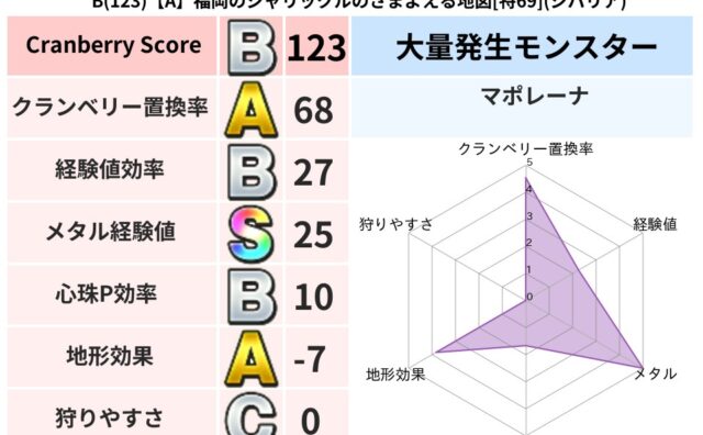 クランベリーボット判定結果の詳細クランベリースコア:103クランベリー置換率:65%大量発生モンスター:マポレーナヒャド超耐性(59%)超耐性・弱耐性なし:ドルマこころ道 完全一致モンスターかっちゅうアリ魔人(共通Lv1)どろにんぎょう守り...
