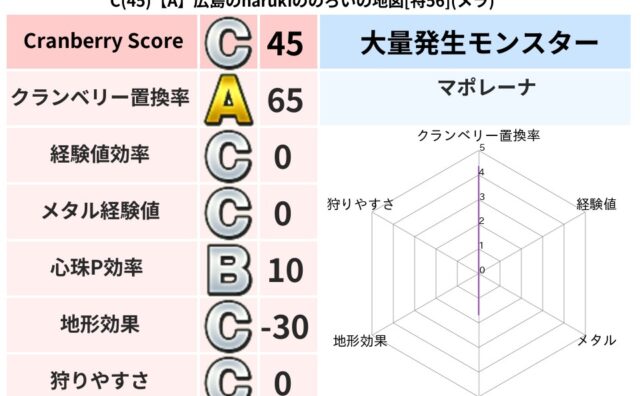 クランベリーボット判定結果の詳細クランベリースコア:114クランベリー置換率:63%大量発生モンスター:マポレーナドルマ超耐性(0%)こころ道 完全一致モンスターしのどれいゴッドハンド(守護道Lv5),大魔導士(魔力道Lv5)ばくだん岩大神...
