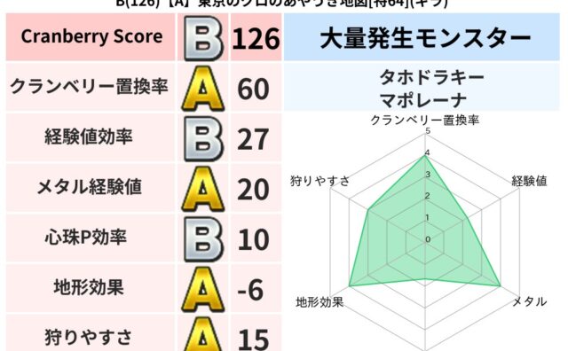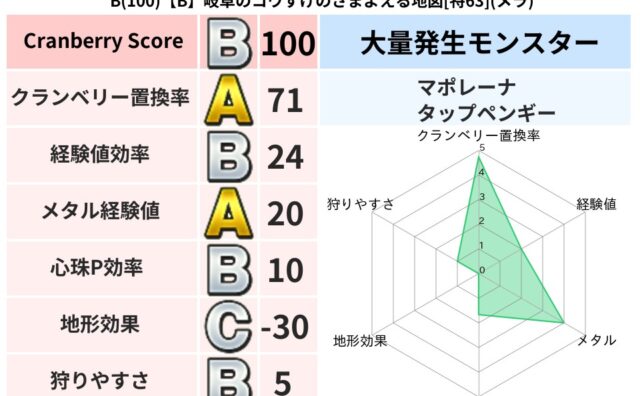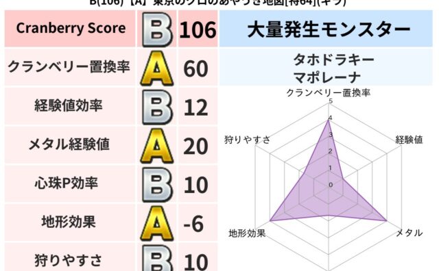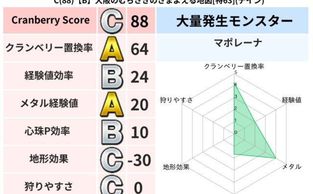 クランベリーボット判定結果の詳細クランベリースコア97クランベリー置換率63%大量発生モンスターマポレーナ超耐性ギラ(14%)こころ道 完全一致モンスターがいこつ魔剣士(共通Lv1)かっちゅうアリ魔人(共通Lv1)ドロル大神官(祈道Lv5)...