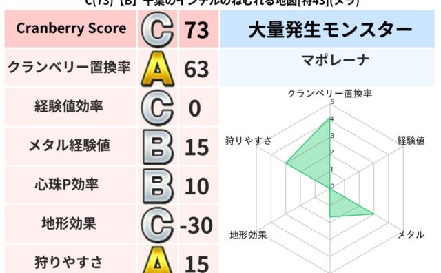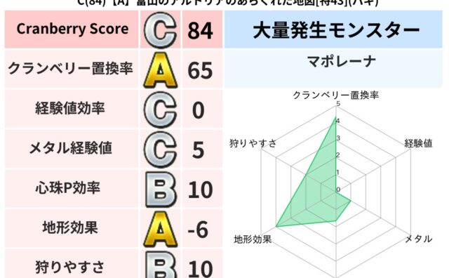 クランベリーボット判定結果の詳細クランベリースコア:59クランベリー置換率:73%大量発生モンスター:スライムつむり,マポレーナヒャド超耐性(33%)こころ道 完全一致モンスターかっちゅうアリ魔人(共通Lv1)おおさそりゴッドハンド(武道L...