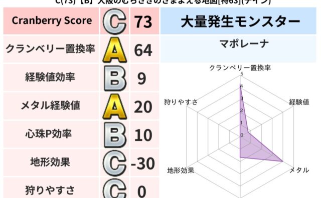 クランベリーボット判定結果の詳細クランベリースコア:127クランベリー置換率:63%大量発生モンスター:マポレーナギラ超耐性(0%)こころ道 完全一致モンスターがいこつ: 魔剣士(共通Lv1)かっちゅうアリ: 魔人(共通Lv1)ドロル: 大...