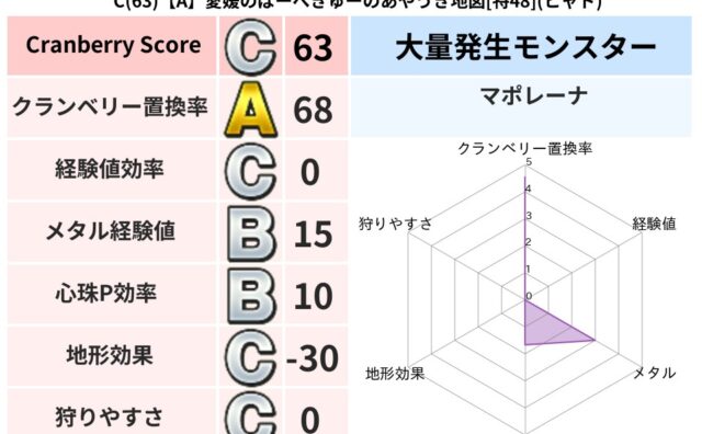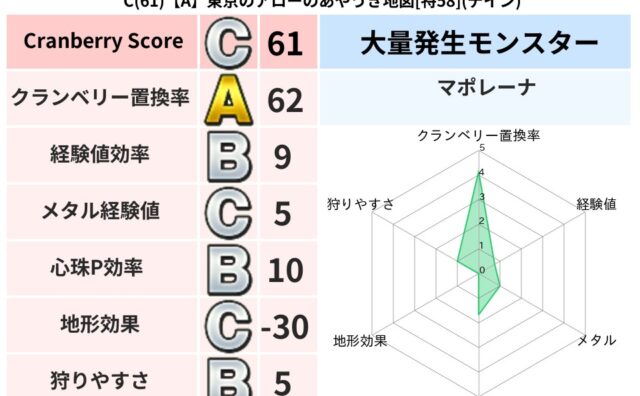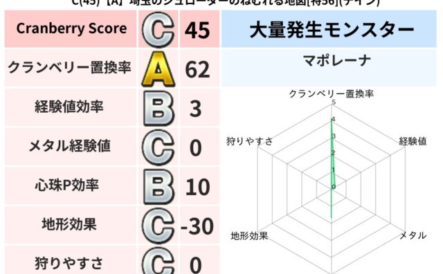 クランベリーボット判定結果の詳細クランベリースコア:149クランベリー置換率:62%大量発生モンスター:マポレーナジバリア超耐性(0%)こころ道 完全一致モンスターデビルアーマー: 大神官(舞道Lv5)リカントマムル: ドラゴン(竜道Lv5...