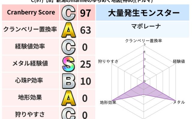 クランベリーボット判定結果の詳細クランベリースコア90クランベリー置換率61%大量発生モンスターマポレーナ超耐性イオ(1%)系統狩り悪魔系45%こころ道 完全一致モンスターねこまどうニンジャ(風道Lv5)みならいあくまニンジャ(風道Lv5)...