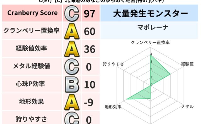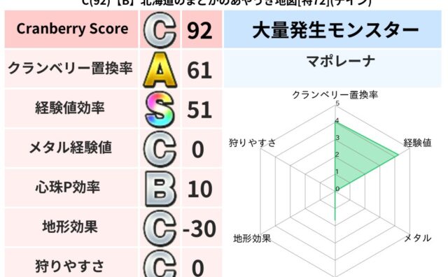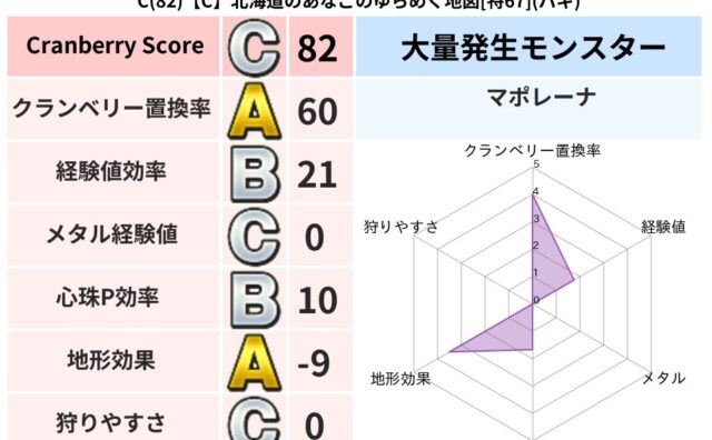 クランベリーボット判定結果の詳細クランベリースコア78クランベリー置換率62%大量発生モンスターマポレーナ超耐性ドルマ(52%)こころ道 完全一致モンスタージェリーマン魔剣士(魔道Lv5)しのどれいゴッドハンド(守護道Lv5)大魔道士(魔力...