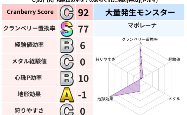 クランベリーボット判定結果の詳細クランベリースコア60クランベリー置換率65%大量発生モンスターマポレーナ超耐性ギラ(49%)こころ道 完全一致モンスターどれいへいしドラゴン(人道Lv5)さまようたましいドラゴン(人道Lv10)マポレーナゴ...