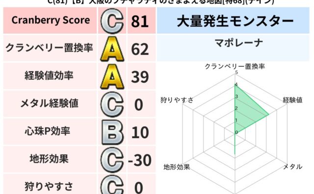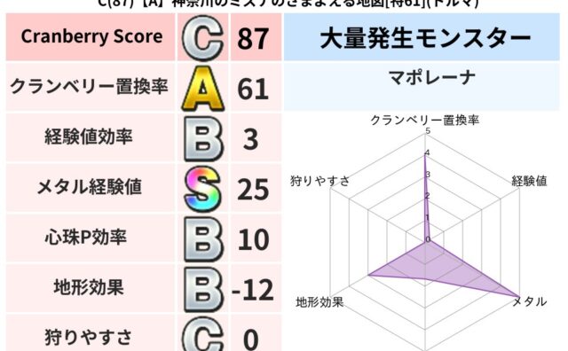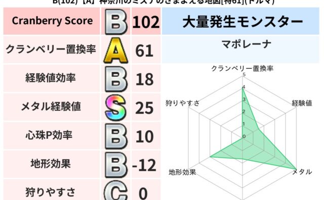 クランベリーボット判定結果の詳細クランベリースコア111クランベリー置換率62%大量発生モンスターマポレーナ超耐性ジバリア(9%)系統狩り悪魔系40%こころ道 完全一致モンスターがいこつ魔剣士(共通Lv1)ストーンマンゴッドハンド(守護道L...