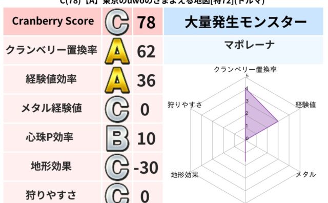 クランベリーボット判定結果の詳細クランベリースコア78クランベリー置換率62%大量発生モンスターマポレーナ超耐性ドルマ(52%)こころ道 完全一致モンスタージェリーマン魔剣士(魔道Lv5)しのどれいゴッドハンド(守護道Lv5)大魔道士(魔力...